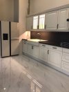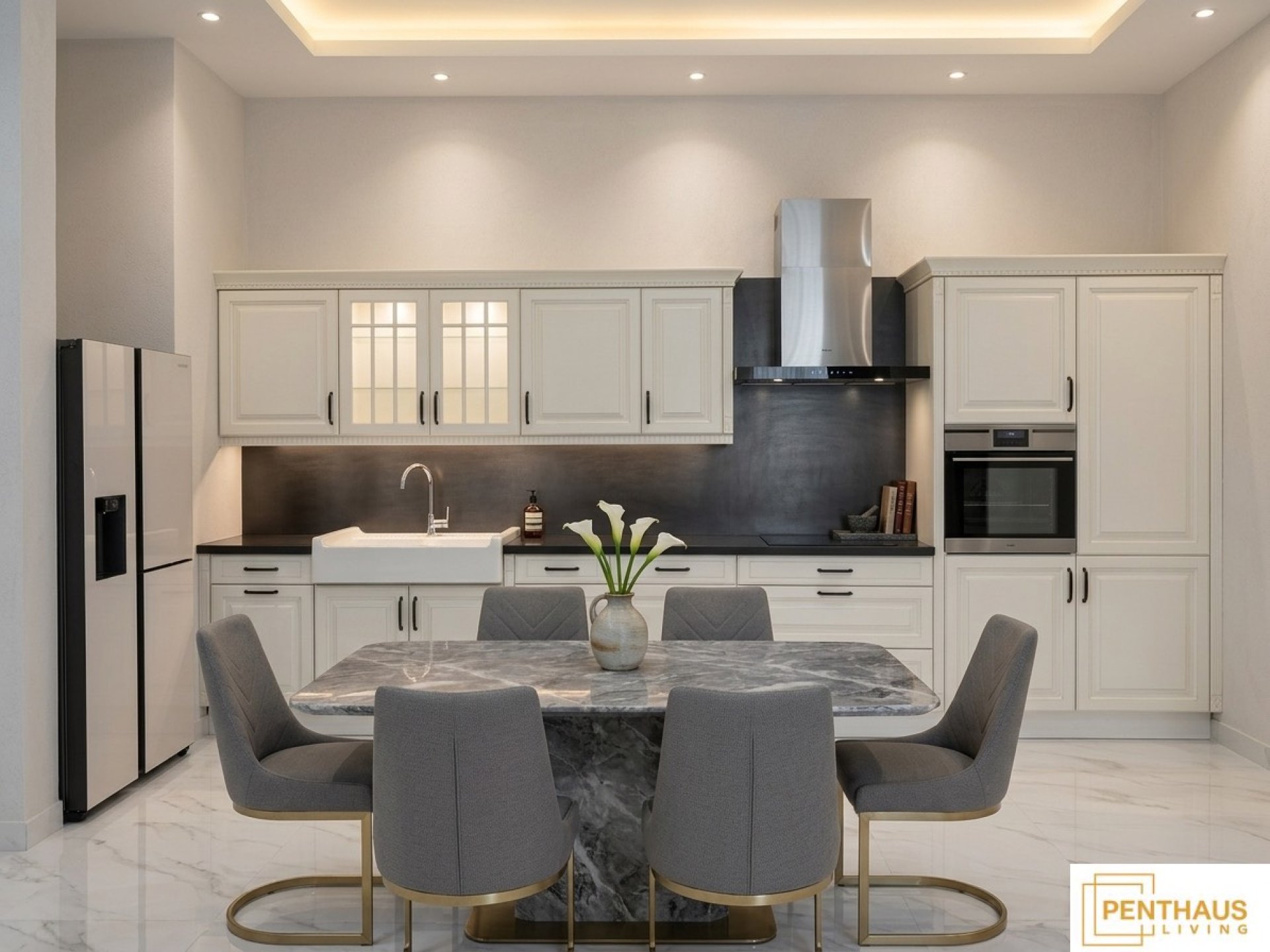 High gloss Carrara marble look porcelain flooring reflects natural light beautifully throughout the day, making the kitchen feel spacious even when the space itself is measured. The open plan connection to a grey marble dining set reinforces the kitchen as the heart of the home not just a room for cooking, but a space the whole family gravitates toward.